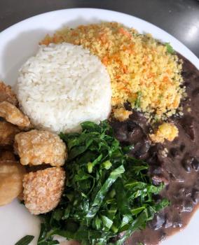 Acompanha arroz, feijoada ,farofa ,torresmo e couve refogada